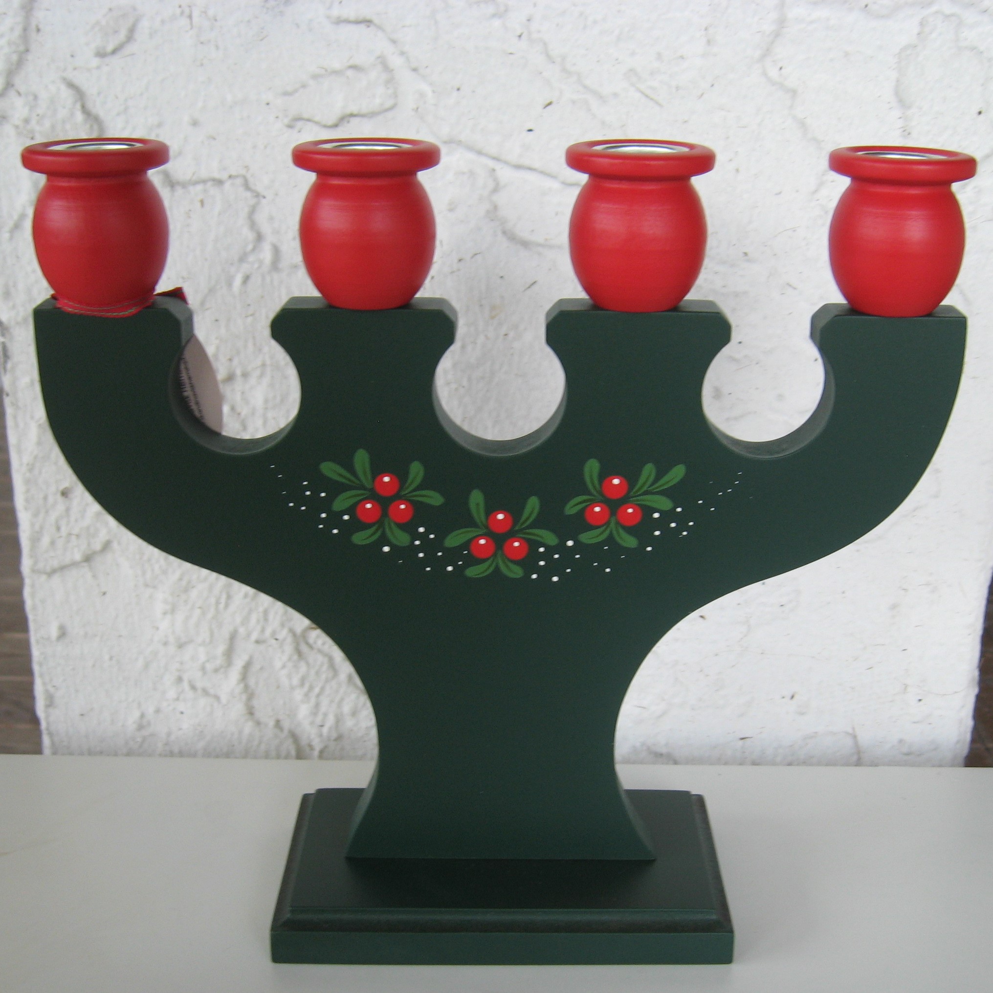 4 arm green wood candle holder “lingonberries” 9″ x 10″ Made in Sweden